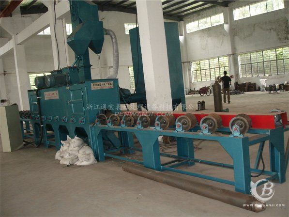 本機(jī)適用于大中型鋼管的表面清理和強(qiáng)化。經(jīng)過清理后的鋼管呈現(xiàn)銀白色的金屬光澤,其表面抗拉抗壓強(qiáng)度提高。本機(jī)為通過式,輥道連續(xù)輸送工件,邊移動邊旋轉(zhuǎn),不需人工上料,生產(chǎn)效率高,清理效果好。